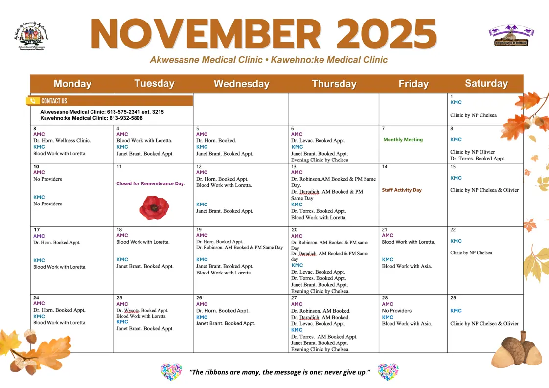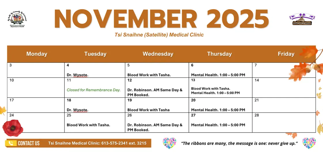EVENING CLINIC ADDED AT KAWEHNO:KE MEDICAL CLINICThe Kawehno:ke Medical Clinic is pleased to announce that an evening clinic with Nurse Practitioner Chelsea Albright will be available on Thursday, October 30. This additional clinic is being offered alongside the regular daytime schedule to better accommodate community members. To book an appointment for the evening clinic, please contact the Kawehno:ke Medical Clinic at 613-932-5808. |